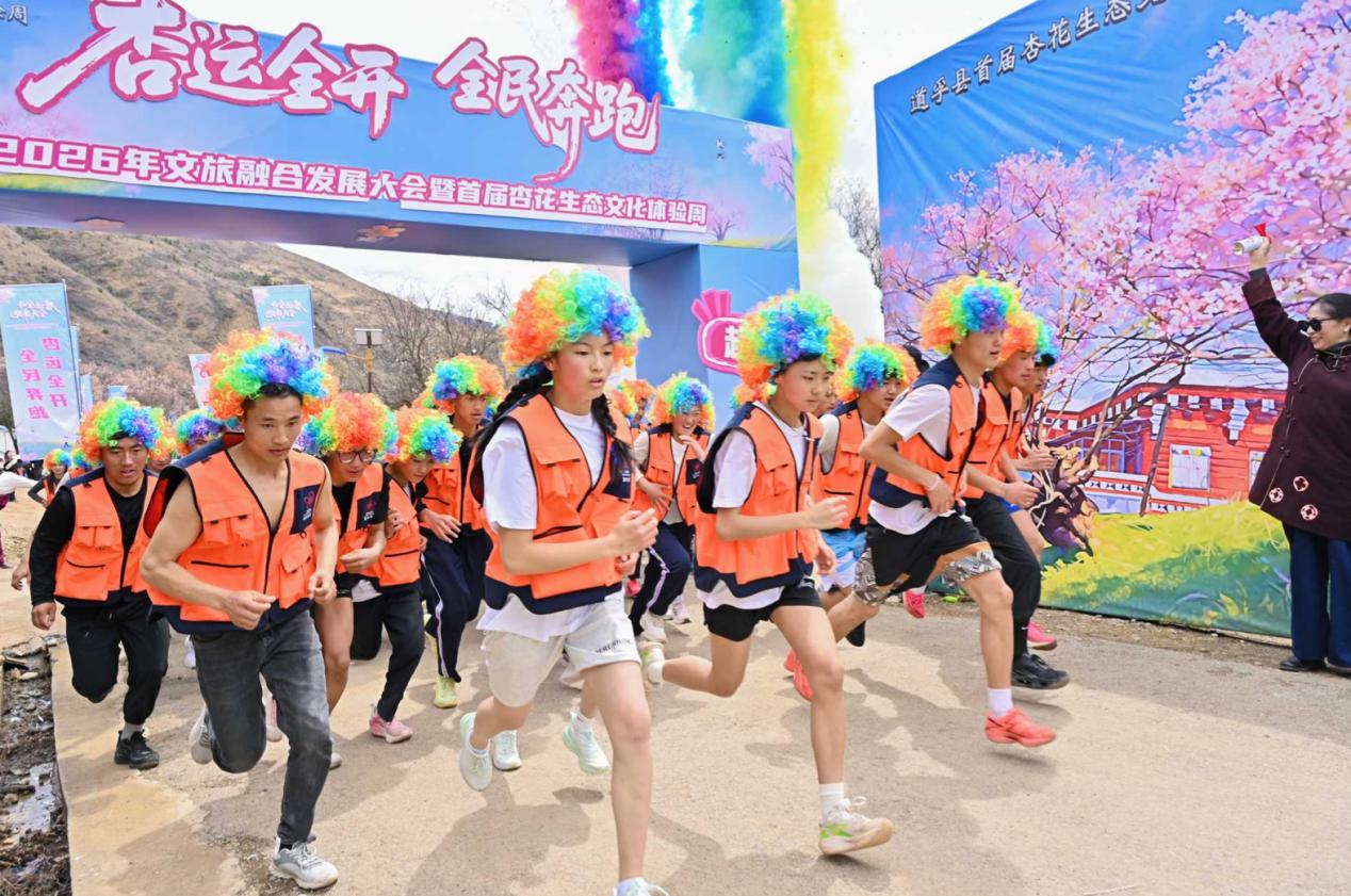 头戴彩色假发、身穿橙色马甲,道孚200多名群众学生在杏花雨中欢乐开跑