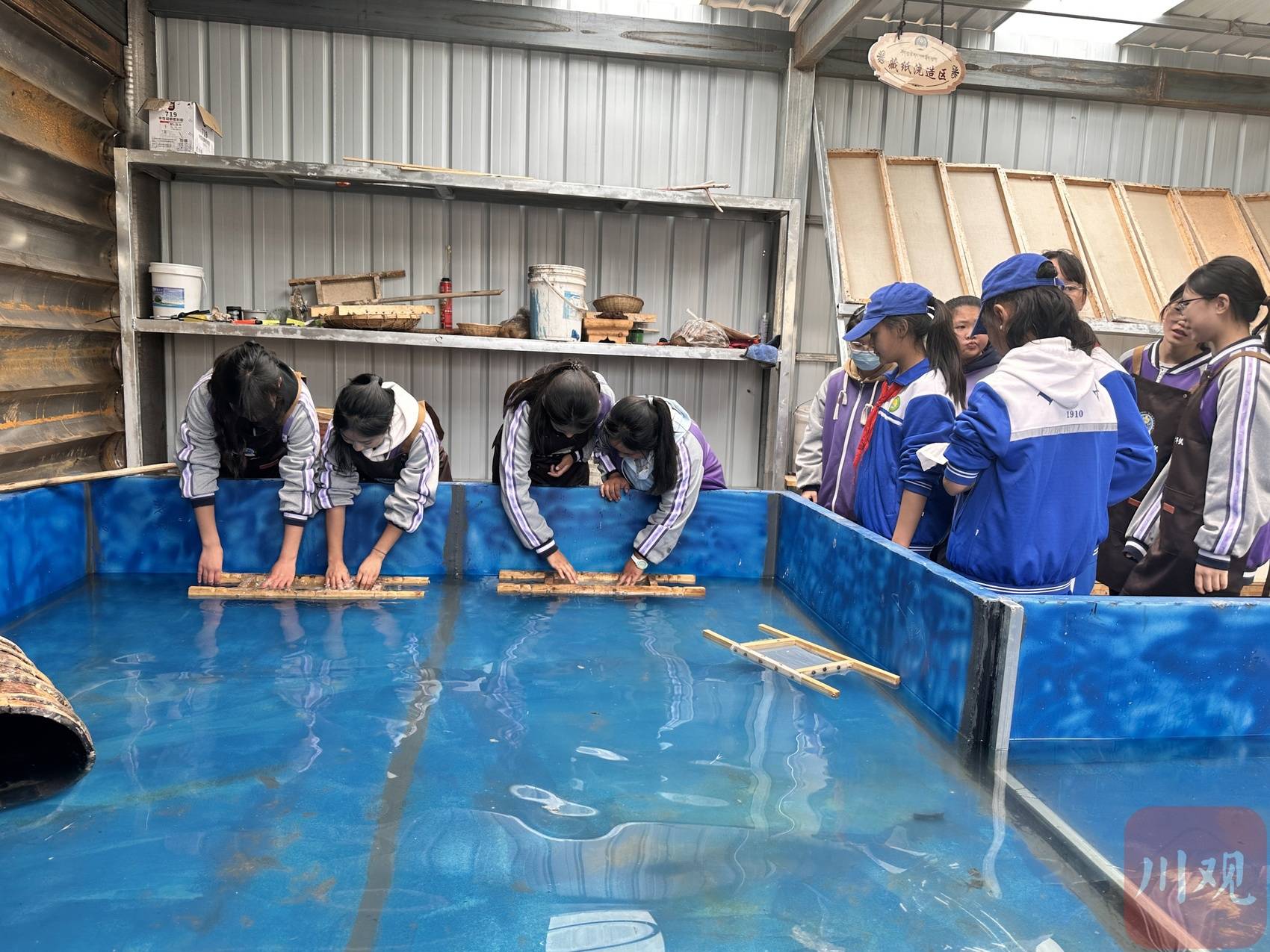 “大家凑过来闻一闻,这纸是不是有股淡淡的药味?”工坊二楼的藏纸制作区,藏纸技艺老师龙青举起一张半干的藏纸,指尖轻轻抚过纸面的纤维纹理。