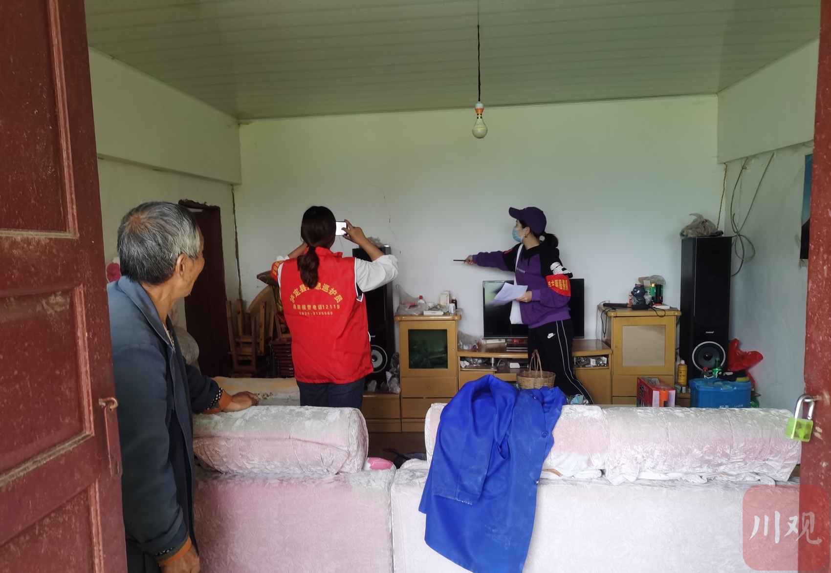 泸定县纪检监察干部、泸桥镇山岔村第一书记黄华敏(右一)核查群众房屋受损情况