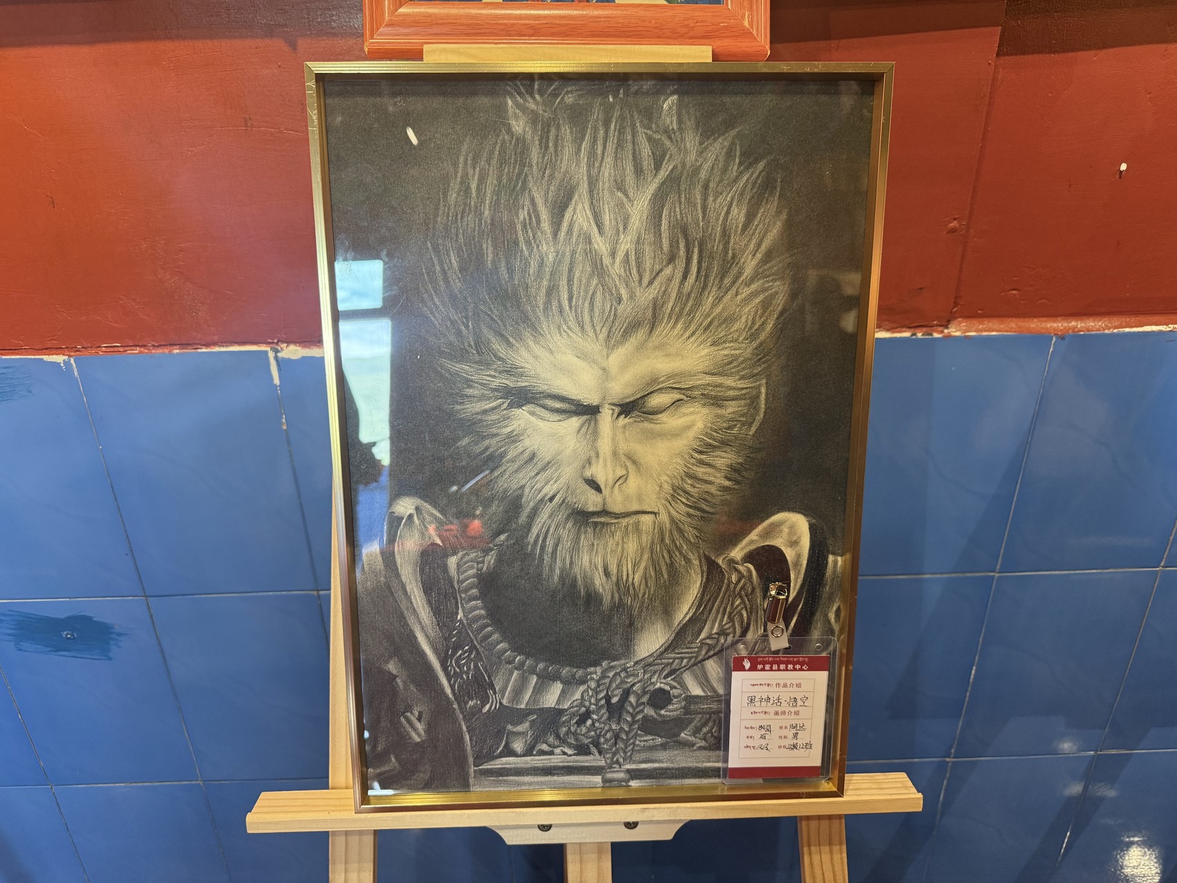 而在炉霍县职教中心二楼的专属展厅里,学生们的作品更是摆得满满当当。除了传统唐卡,更有不少突破固有形态的创新之作——从黑神话悟空到素描哪吒,再到独具巧思的石头画,令人耳目一新。