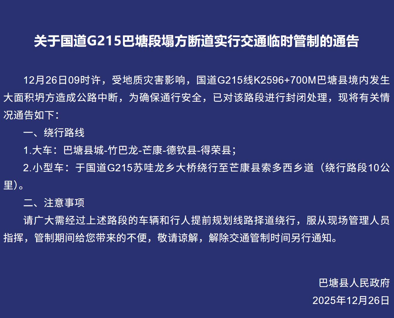 12月26日,川观新闻记者从甘孜州巴塘县政府获悉,当日9时许,受地质灾害影响,国道G215线K2596+700M巴塘县境内发生大面积塌方造成公路中断,为确保通行安全,已对该路段进行封闭处理。