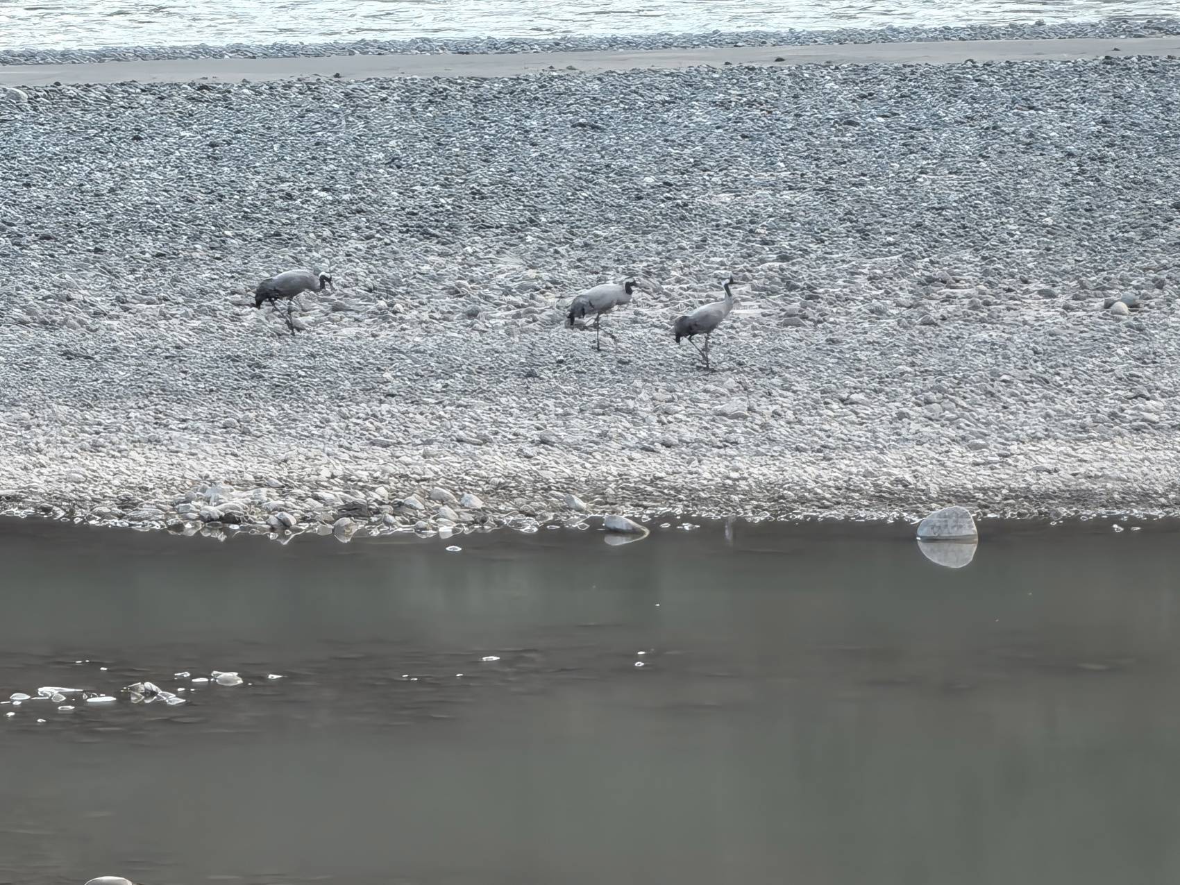 视频中的几只黑颈鹤踏在河边闲庭信步,优雅、从容,与周边优美的湖光山色一道,构成了一副和谐自然的美景。