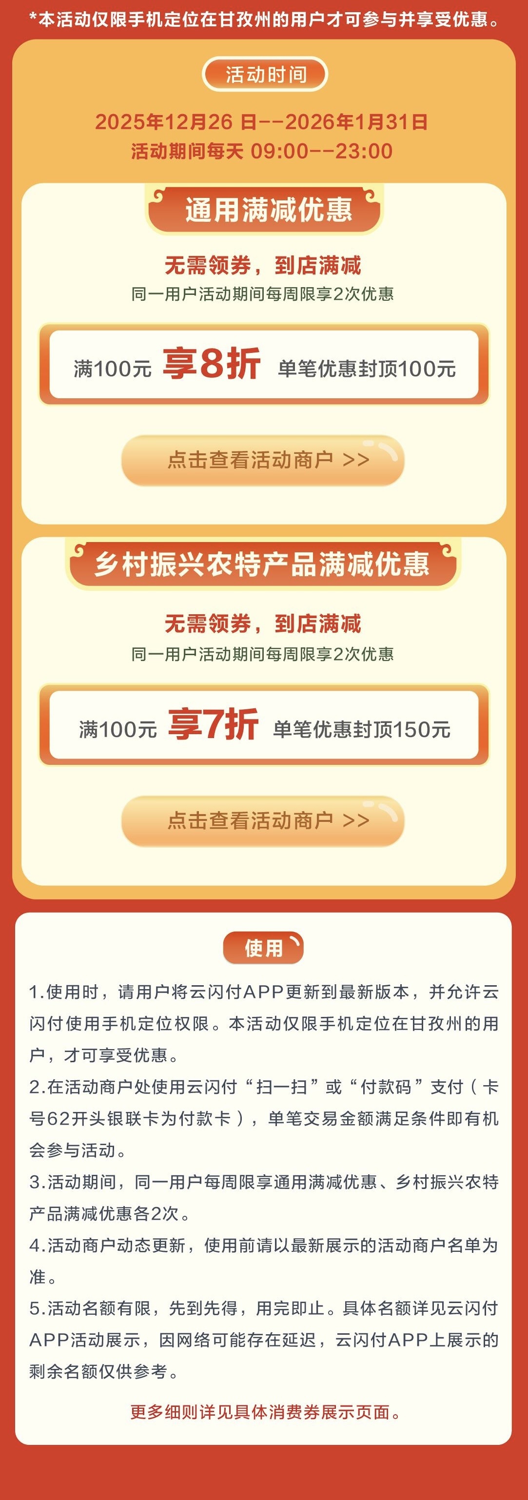 线上活动将聚焦“通用券”与“乡村振兴券”两大券种,每日9:00至23:00可通过云闪付平台使用。其中,“通用券”满100元享8折优惠,单笔补贴封顶100元,适用于商超购物、加油站加油、餐饮消费等场景;“乡村振兴券”满100元享7折优惠,单笔补贴封顶150元,重点支持农特产品消费,助力家乡好物“出圈”。值得注意的是,单用户每周限享通用券和乡村振兴券各2次优惠,补贴资金实时调整,发完即止。