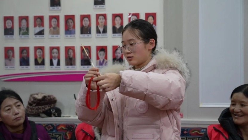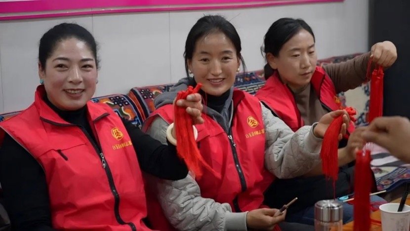 12月27日,在甘孜州白玉县河东社区巾帼振兴工坊白玉站内,30余名妇女围坐一堂,手中彩线穿梭,在省妇联特邀专业老师的耐心指导下,认真学习中国结流苏的编制技艺。