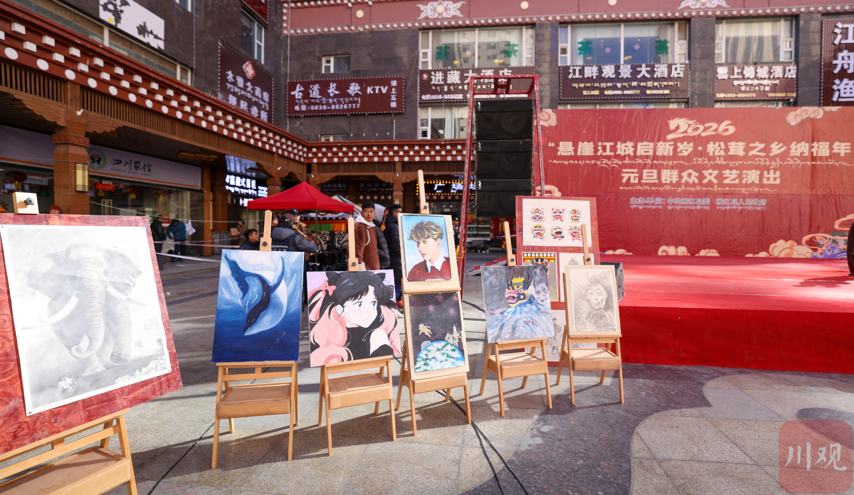 此外,活动现场周边精心陈列了雅江县定向艺术生们创作的绘画佳作,以及非遗传承人亲手制作的传统手工艺精品。这些作品既展现了青年艺术生的创新活力,又彰显了非遗技艺的传承之美,为活动增添了浓厚的文化底蕴与艺术氛围。