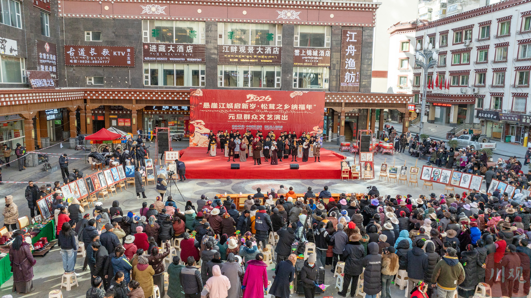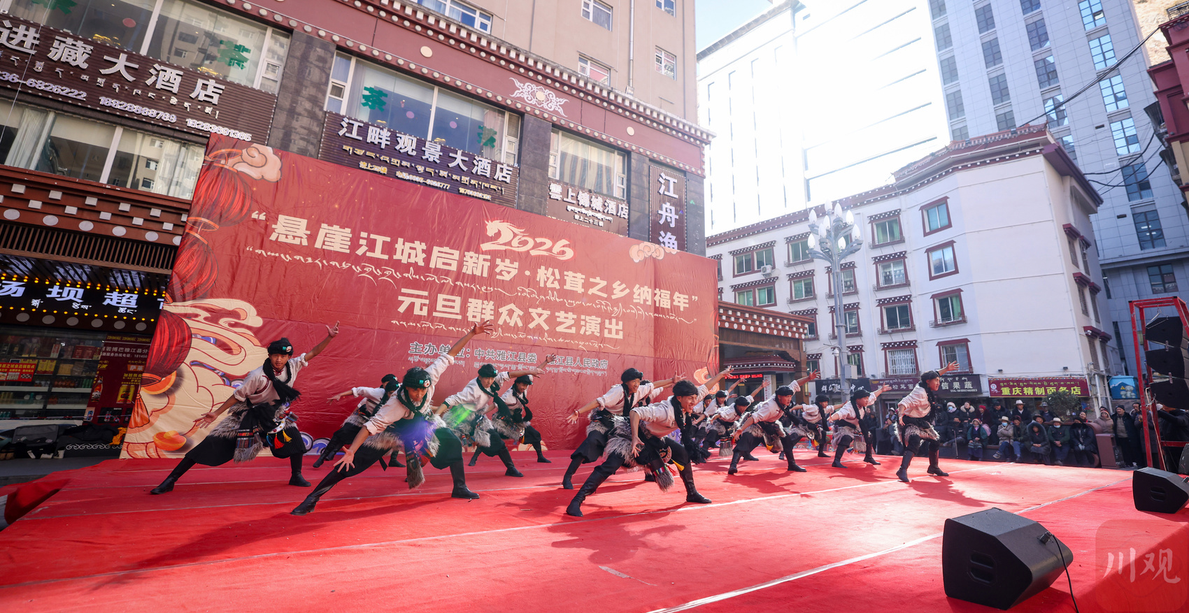 2026年1月1日上午,雅江县文化广场上人头攒动、欢声笑语。在冬日暖阳下,当地农牧民、社区文艺爱好者、退休干部、非遗传承人纷纷登上舞台,一场以“悬崖江城起新岁,松茸之乡纳福年”为主题的2026年元旦群众文艺演出在热闹喜庆的氛围中拉开帷幕。