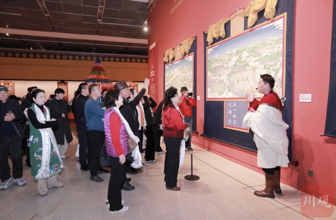 此次展览以国家级非物质文化遗产郎卡杰唐卡为艺术载体,创新采用“红色+非遗”的展陈理念,系统呈现红军长征在康巴地区的革命历史与民族团结精神,以文化传承的方式向长征胜利90周年致敬。