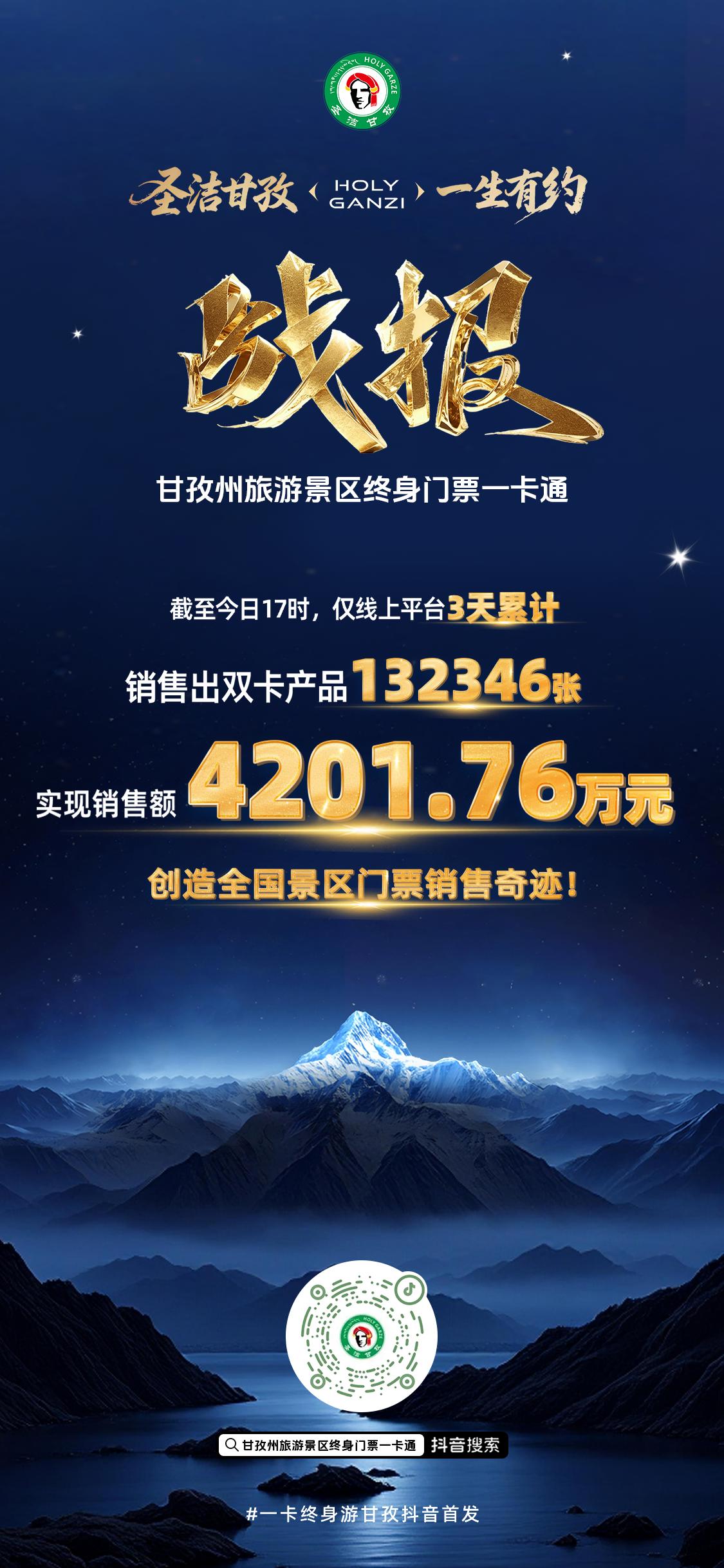 1月30日,记者从甘孜州文广旅局获悉,自1月28日开始对外发售的甘孜州旅游景区终身门票一卡通销售成绩喜人。截至1月30日17时,仅线上平台累计售出132346张,包含单个景区的终身畅游卡和14家景区终身畅游的贡嘎海棠卡、贡嘎金雕卡。两类卡实现销售额4201.76万元,创造了全国景区门票销售奇迹。