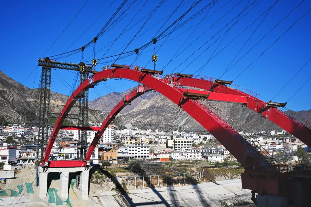 近日,随着最后一节钢箱拱肋精准吊装到位,国道G215与G214连接线工程的控制性节点——瓦卡金沙江大桥顺利完成主拱合龙。作为“金沙江上游峡谷区首座”下承式钢箱系杆拱桥,该桥成功攻克了复杂地形条件下大跨径钢箱拱高精度拼装的技术难题,标志着整体工程已完成约70% ,向着今年6月建成通车的目标迈出了关键一步。