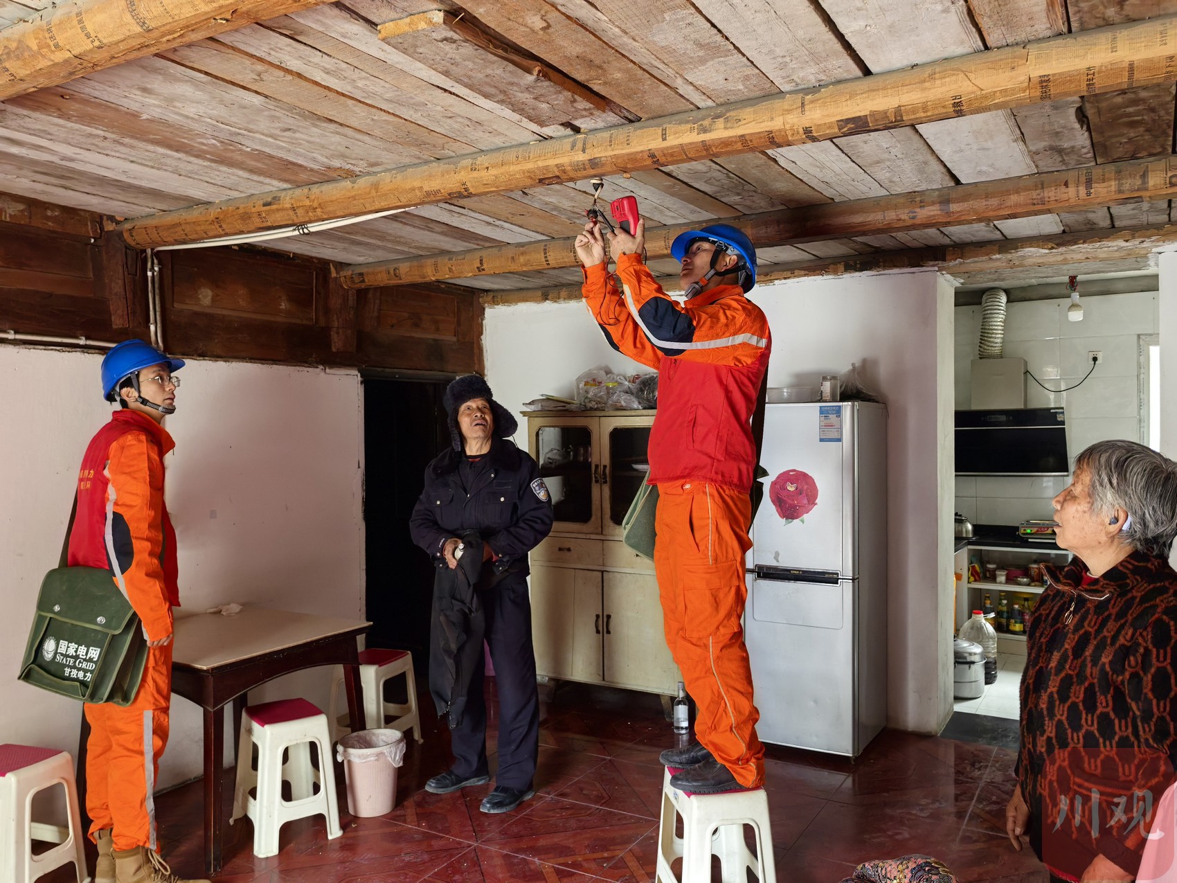 “刘婆婆,我们来给您挂灯笼啦!”在泸定县安乐坝村瑞金路留守老人刘淑琼家中,队员们搬来梯子,麻利地将红灯笼挂在屋檐下,整个房子一下子有了浓浓的年味。今年75岁的刘淑琼婆婆和78岁的封炳禄爷爷一双儿女都在甘孜州其他偏远县城工作,平时老两口独自居住在家。安好灯笼后,陈彦霖注意到老人客厅的白炽灯频繁闪烁,意识到可能是接触不良,便把灯泡的接口重新调整一下,并换上一盏更亮的节能灯。昏暗的小屋瞬间亮堂起来,老人脸上也笑开了花。队员们还把印有抢修电话的台区经理卡片贴在床头,“以后用电有问题,就打这个电话,我们随叫随到。”封爷爷握着队员的手感动地说:“孩子们没在家过年冷冷清清的,现在师傅们上门检查完,还帮着挂灯笼,心里又亮又暖!”