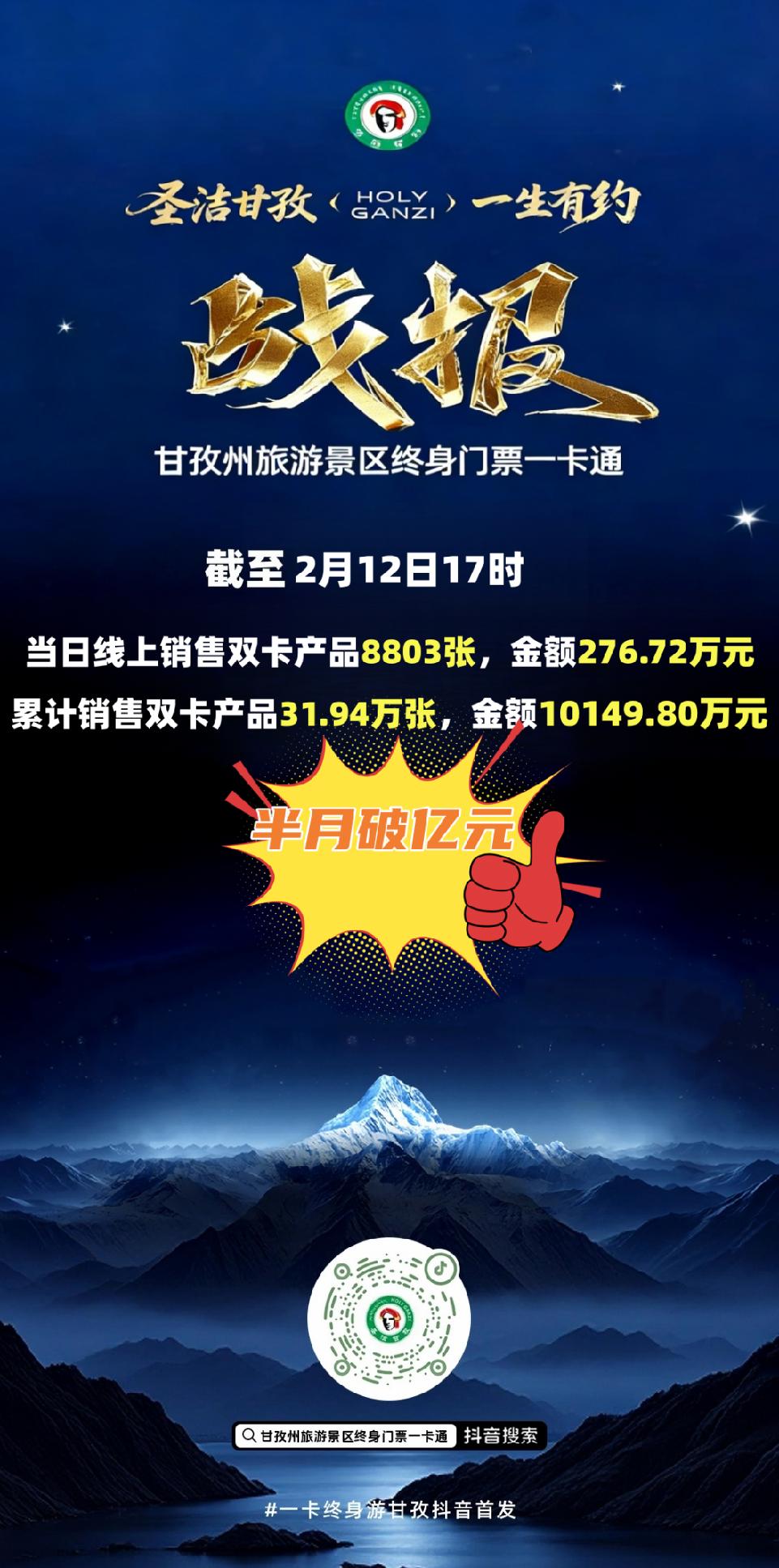 2月12日,记者从甘孜州文化广播电视和旅游局获悉,自1月28日甘孜州“终身畅游卡”正式发售以来,15天内线上销售额已突破亿元。