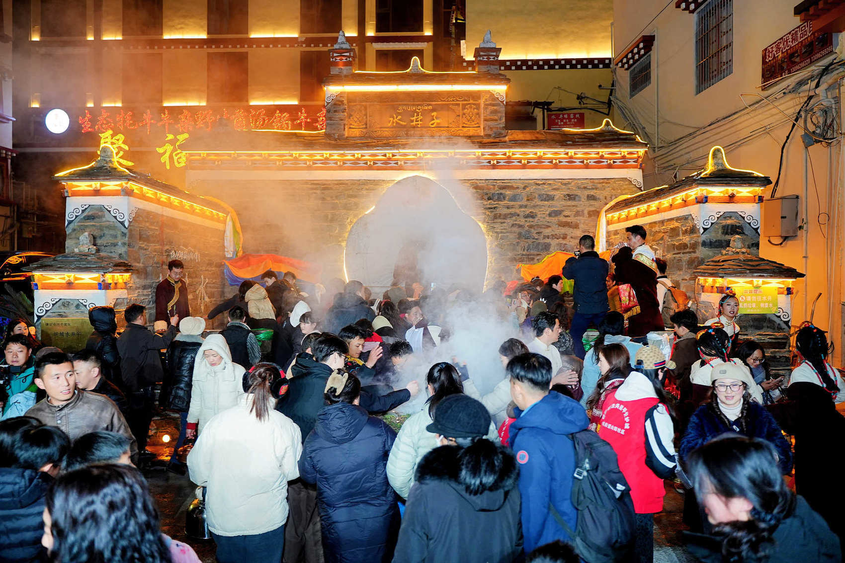 游客和当地群众一起“抢头水”迎新年。(甘孜州传媒中心供图)