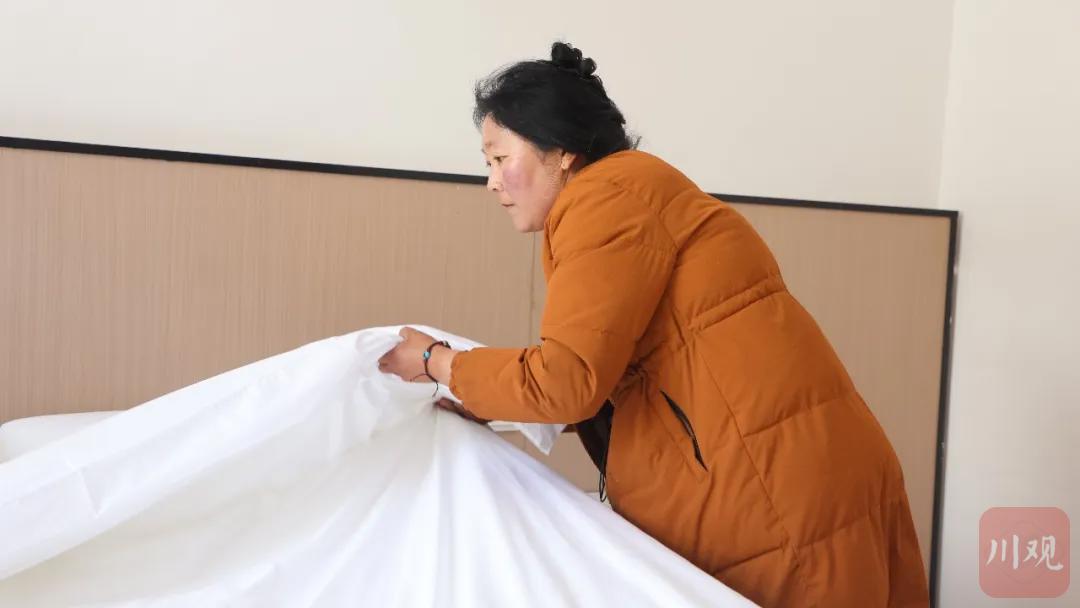 村民正在整理酒店床铺