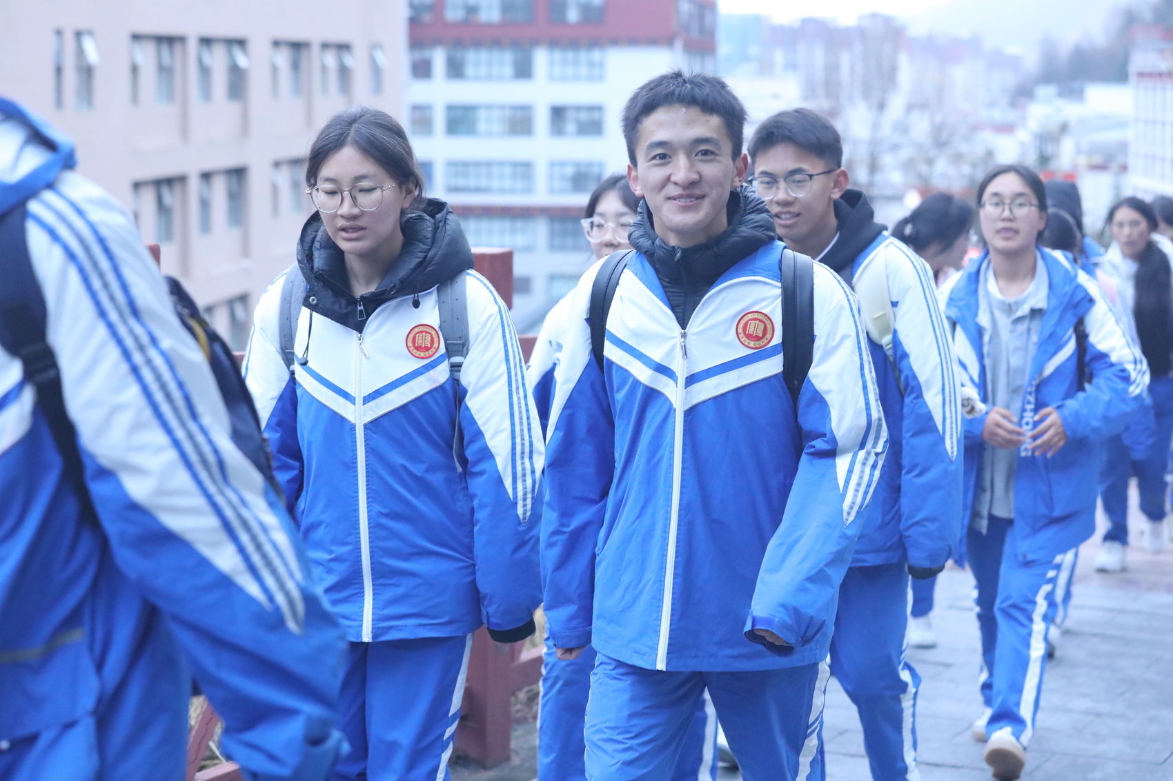 “加油”“再坚持一下”……行进途中,有少数同学体力不支放慢了脚步,身边的同学立刻主动放慢速度,伸手搀扶、并肩前行;有的同学口渴乏力,同伴们及时递上饮用水、零食等;师生们互帮互助、携手前行。