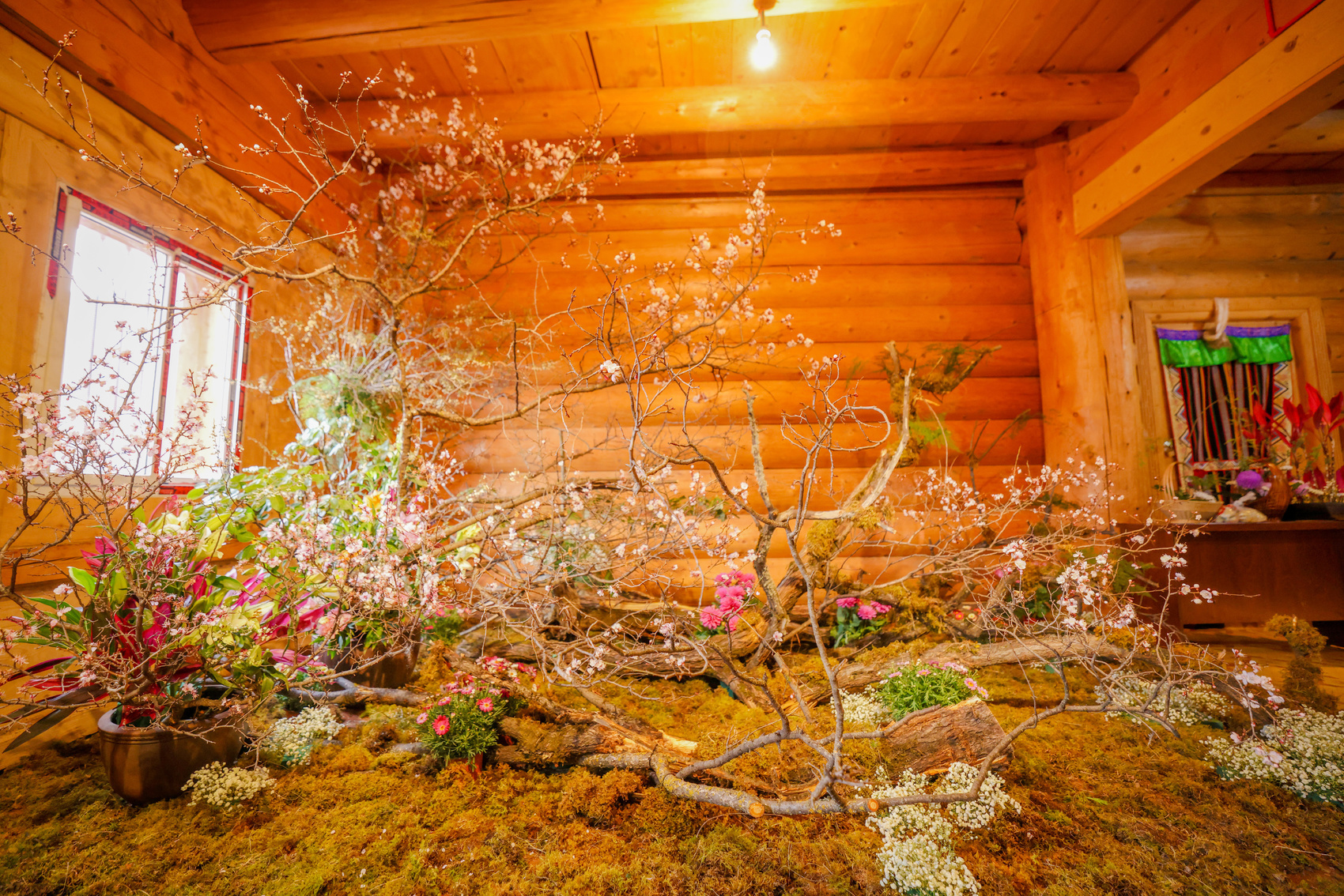 走进花艺展示厅,以杏花为主景的作品格外引人注目。张月理介绍:“这幅作品以杏花为主景,搭配枯木等自然材料,展现道孚山水情形。土地上点缀的满天星恰似即将消融的冰雪,宛若山林从冬日走向春日,予人以心灵的喜悦与生机。”