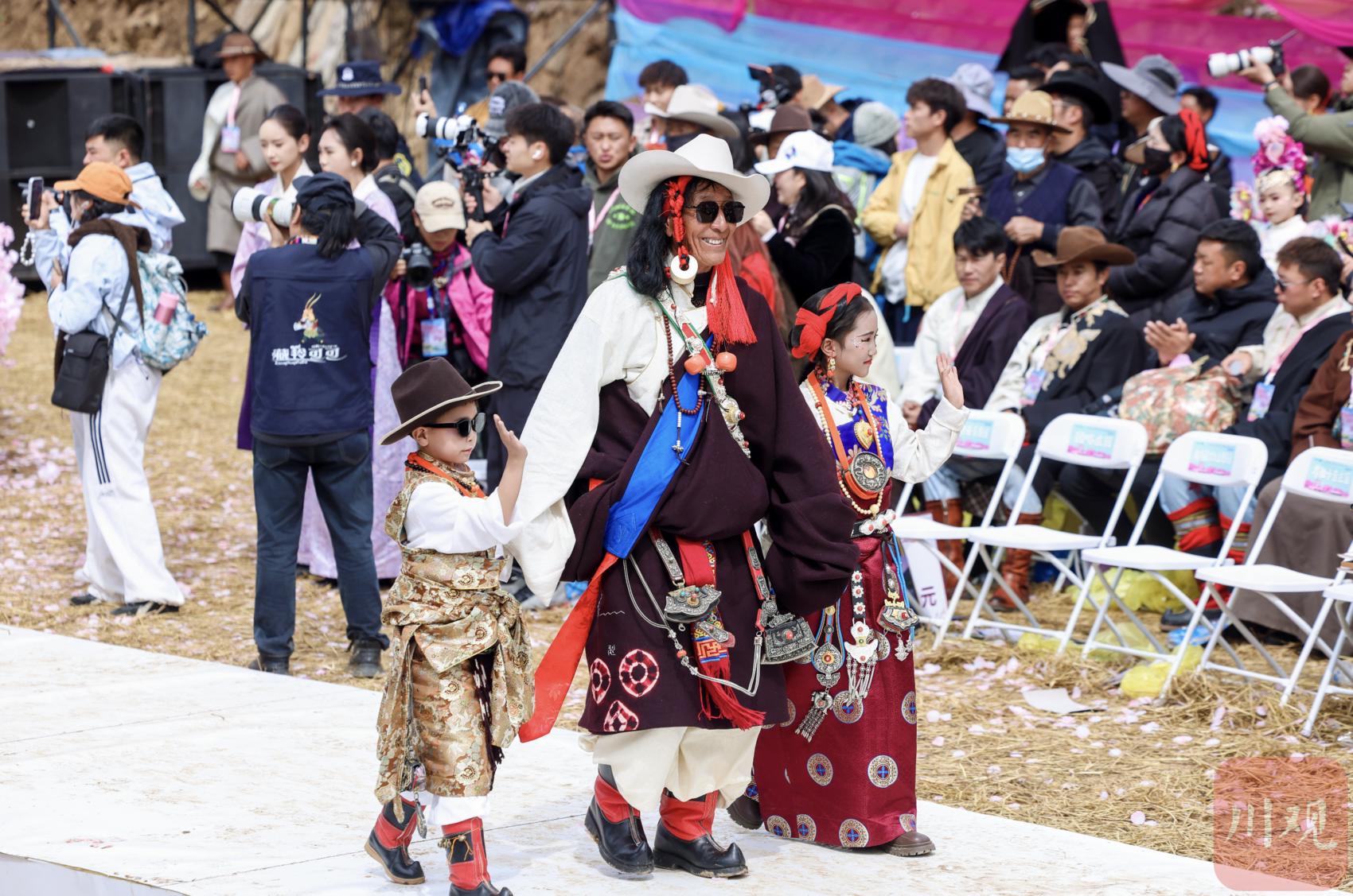 而最打动人心的,是平凡家庭的温情亮相。来自附近村子的四世同堂家庭一同登上秀场,年过八旬的老人穿着亲手缝制的传统藏袍,步履缓慢却从容;年幼的孩子则在杏花树下蹦蹦跳跳,天真烂漫。三代人、四代人跨越岁月的同台,让时尚不再是舞台上的疏离展演,而成为流淌在日常烟火中的传承与陪伴。现场观众纷纷举起手机,记录下这朴素又动人的一幕。