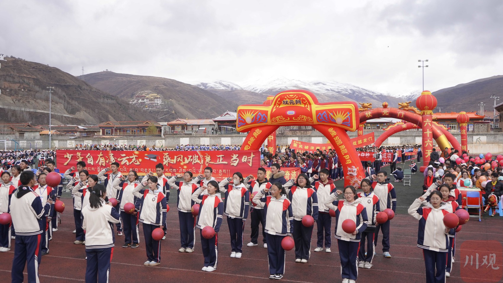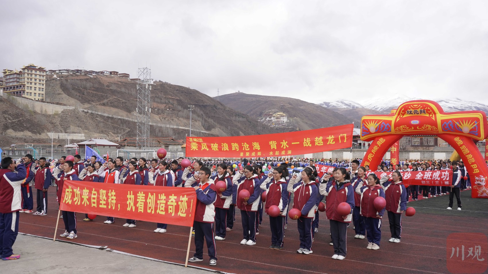 上午时分,伴随着庄严的乐曲,初三、高三年级各班方阵依次步入会场。护旗方队率先通过主席台,五星红旗、校旗与彩旗交相辉映迎风舒展。少年们目光如炬,步伐坚定,以昂扬的姿态在雪域高原上书写着“青春由磨砺而出彩”的信念。